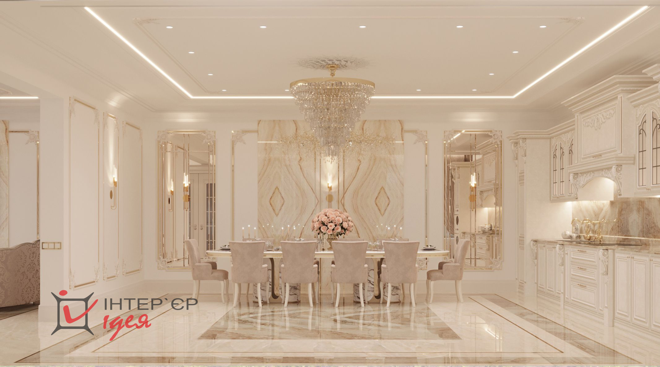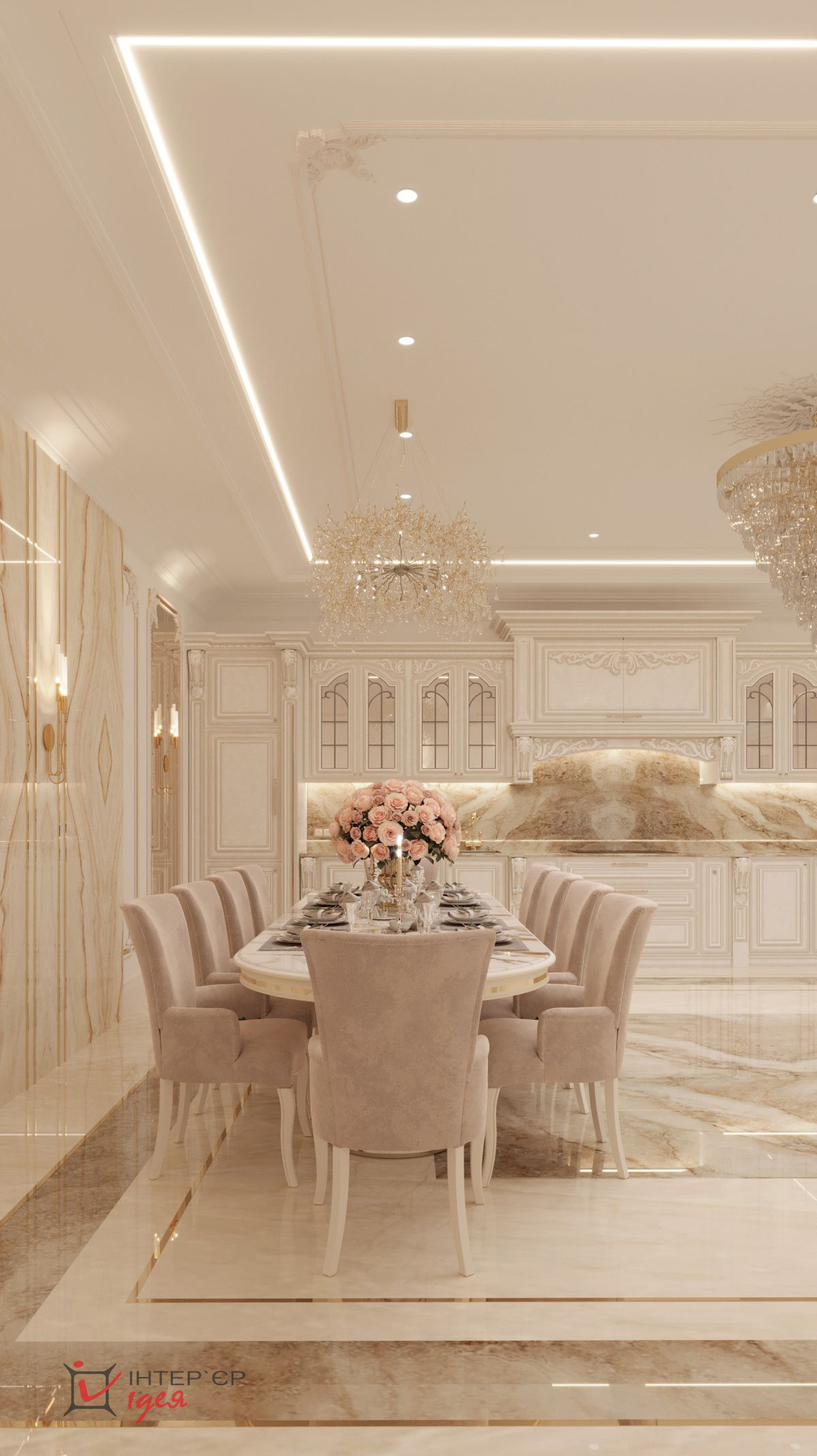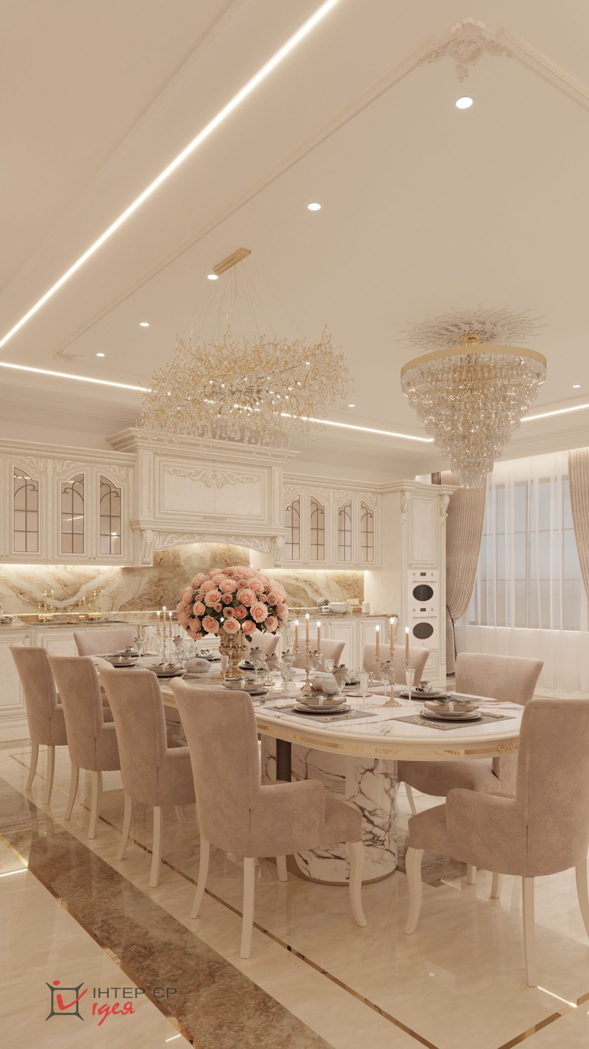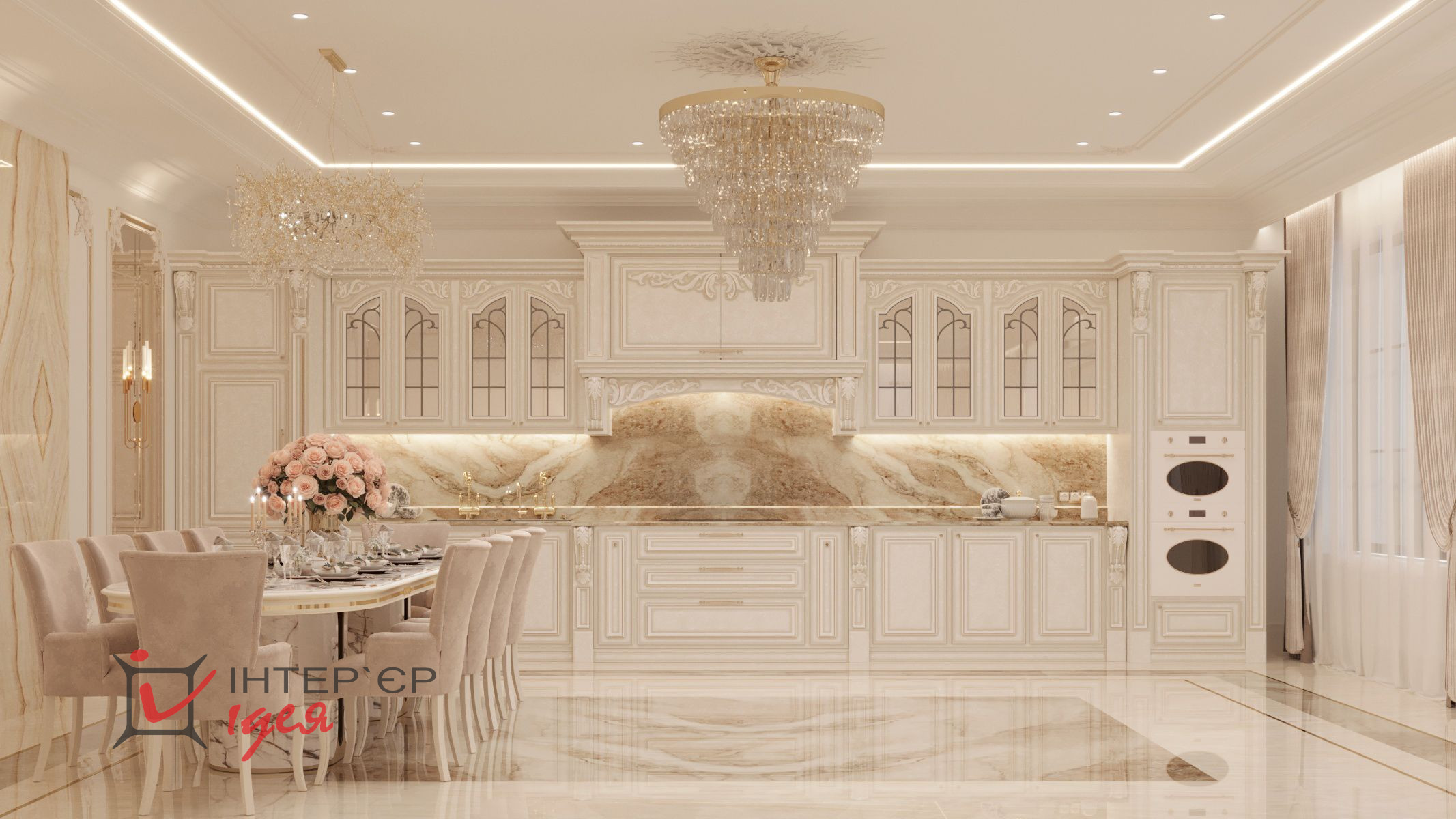Большой обеденный стол с мягкими стульями, обитыми люксовой тканью, идеально подходит для семейных обедов и приятных бесед с друзьями. Большое количество шкафов для хранения посуды и продуктов.