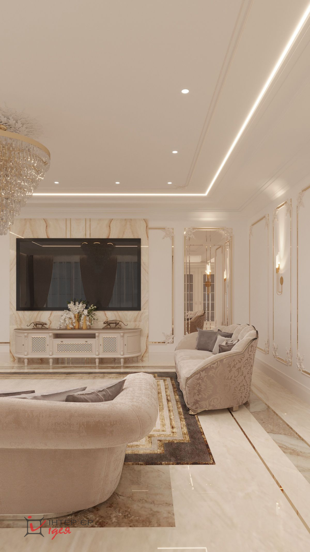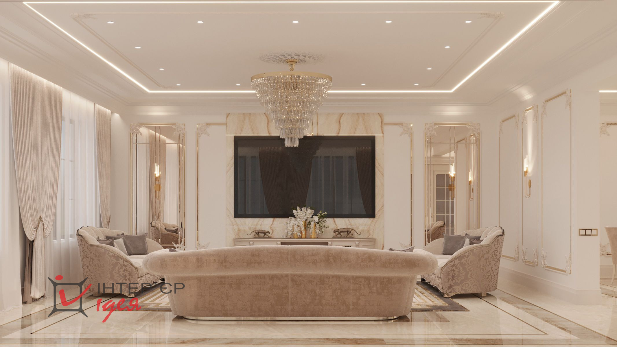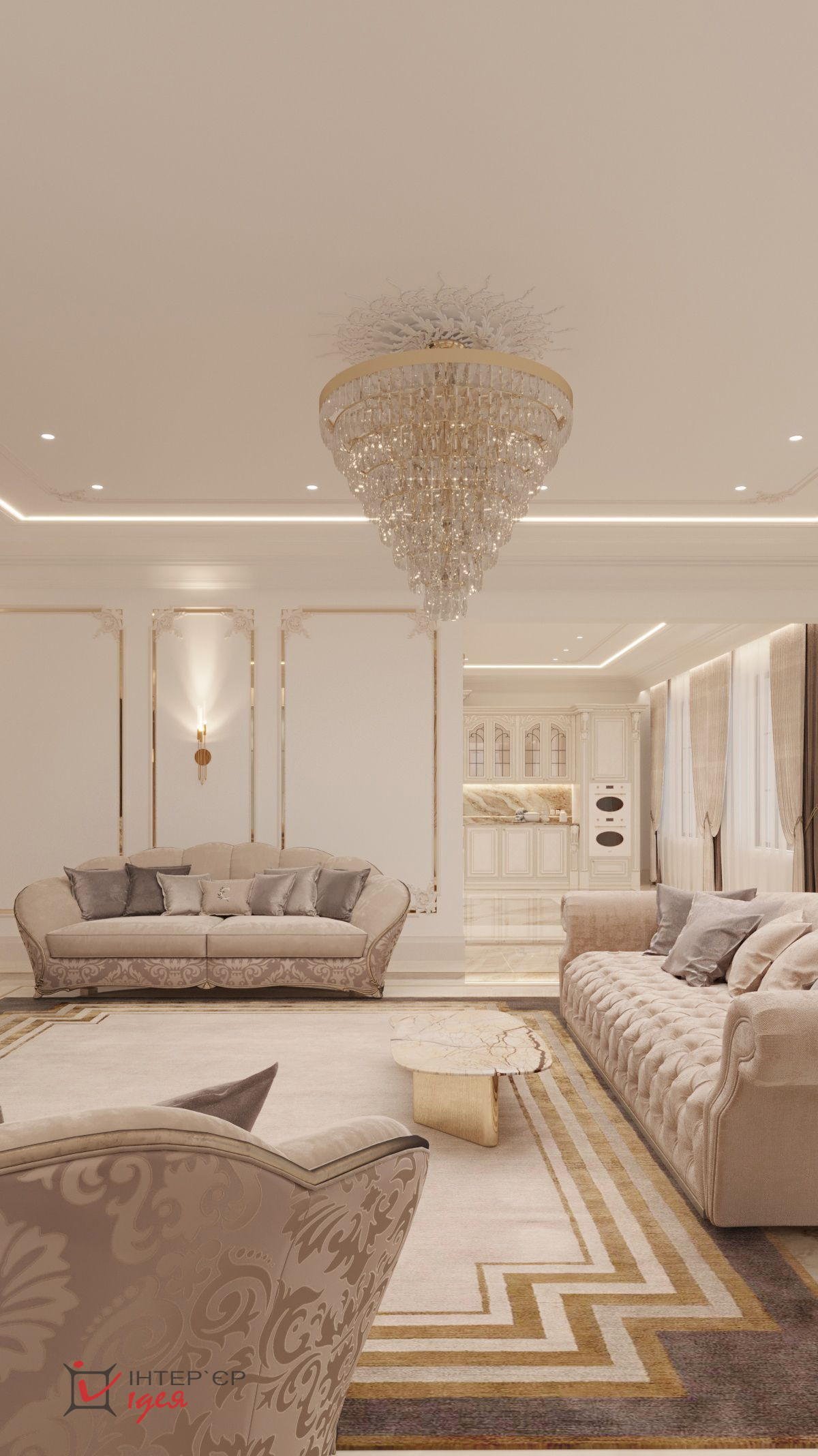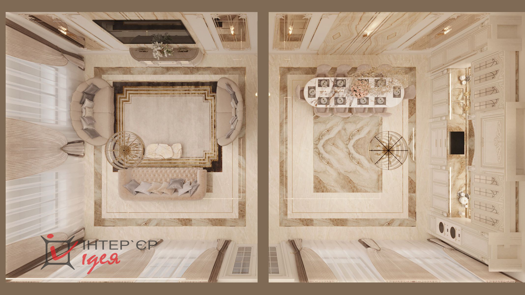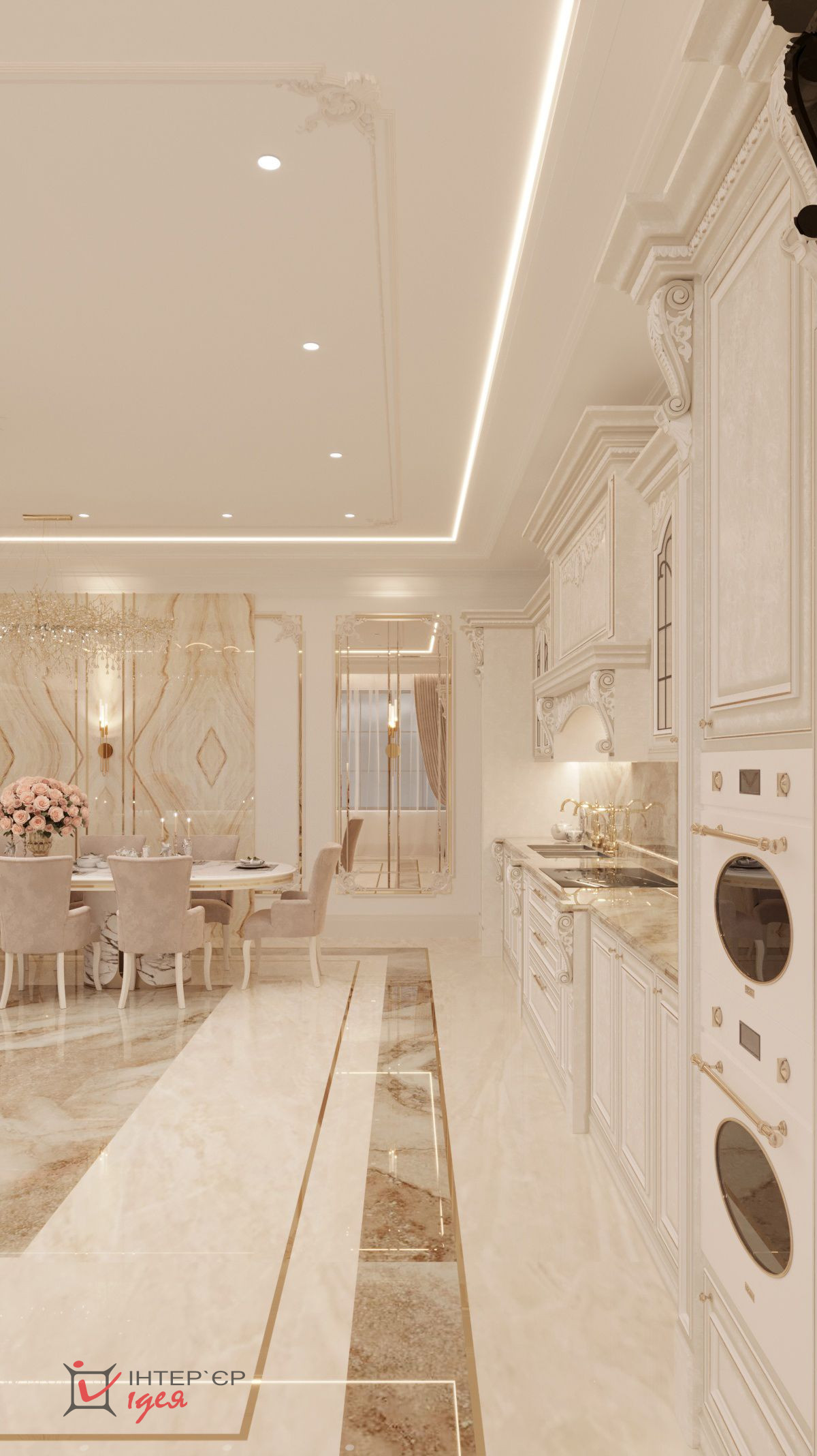 Окна пропускают достаточное количество природного света, создавая ощущение пространства и легкости. Пол, выложенный из двух видов широкоформатного керамогранита с сочетанием латунного профиля, обеспечивает долговечность и легкость в уходе.