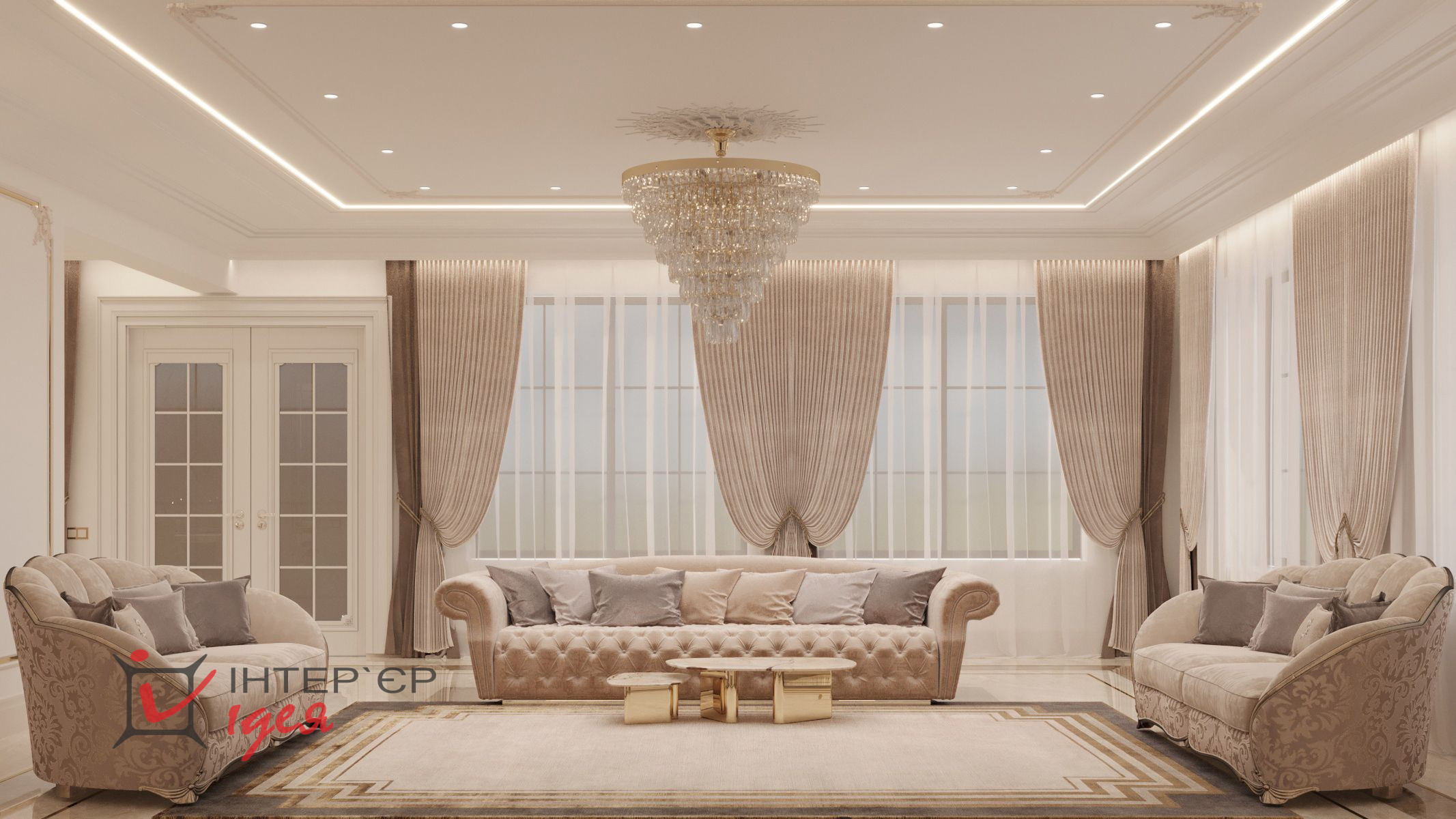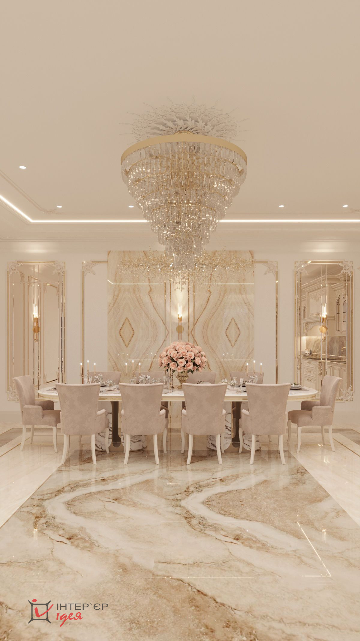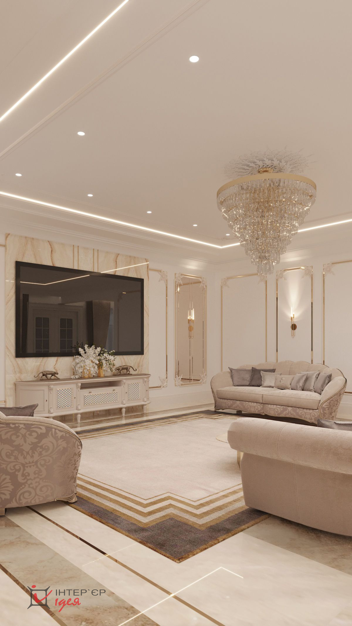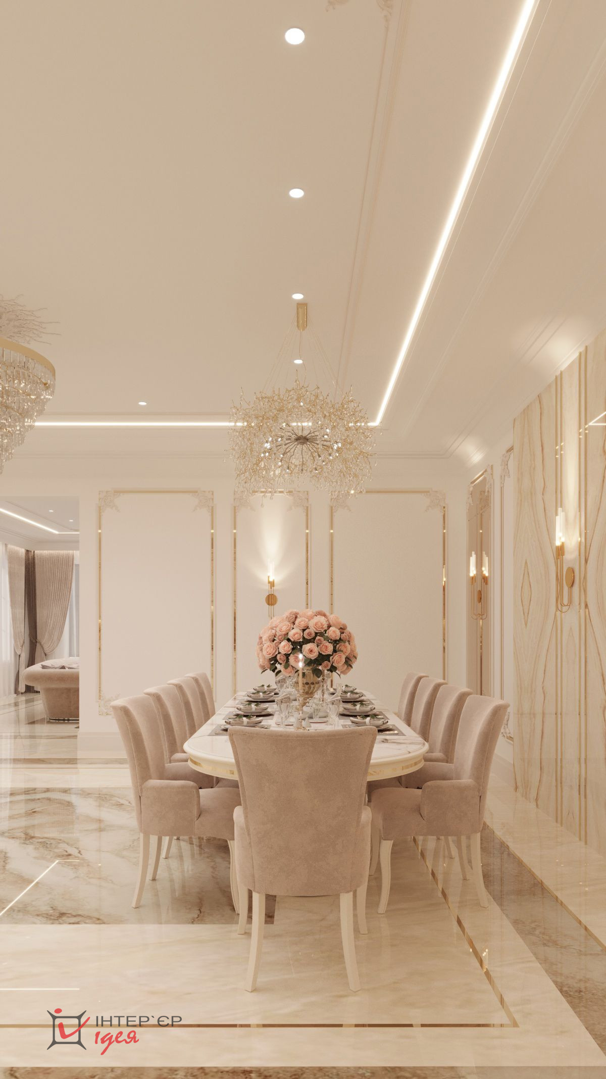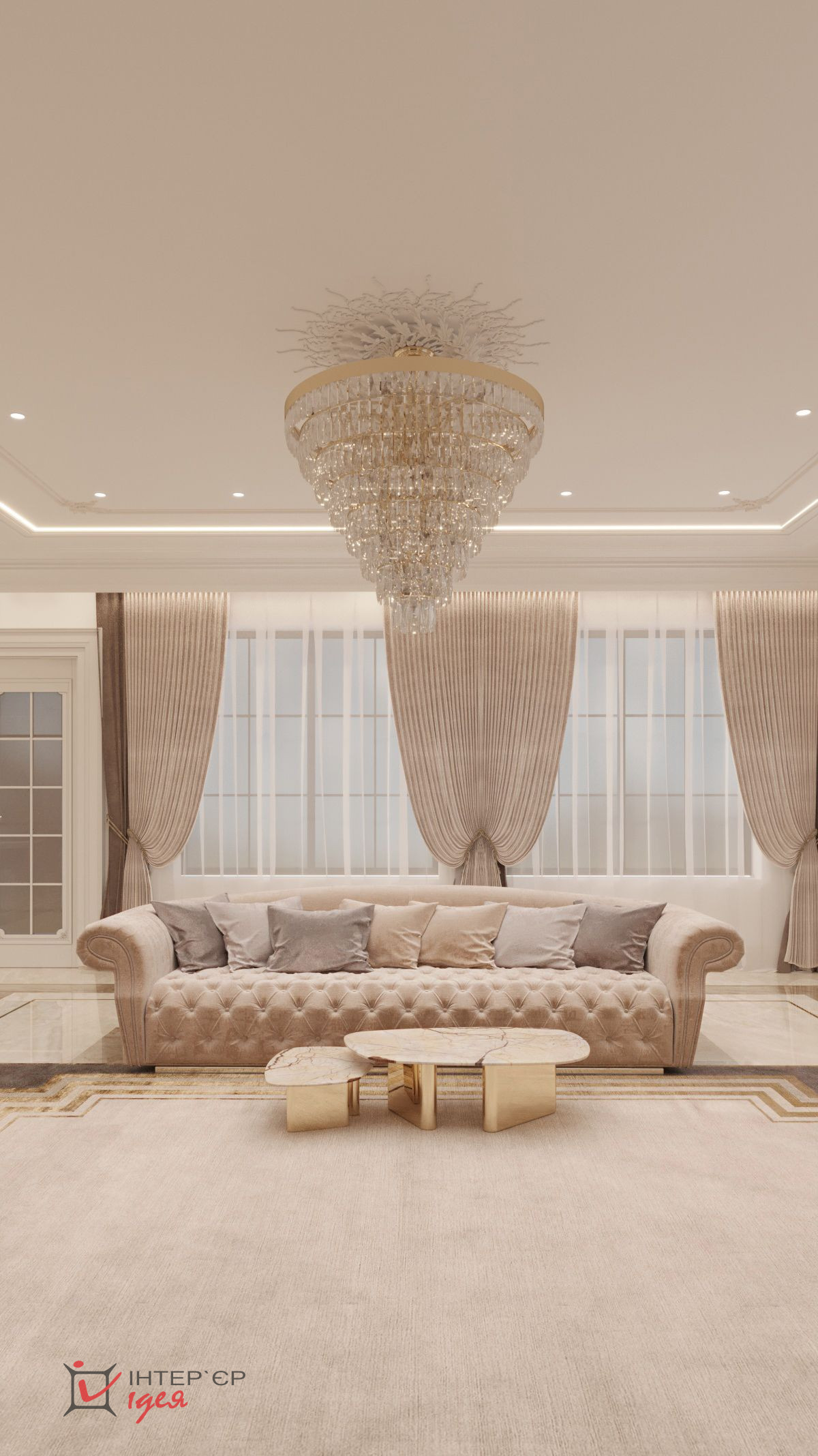 Окна пропускают достаточное количество природного света, создавая ощущение пространства и легкости. Пол, выложенный из двух видов широкоформатного керамогранита с сочетанием латунного профиля, обеспечивает долговечность и легкость в уходе.