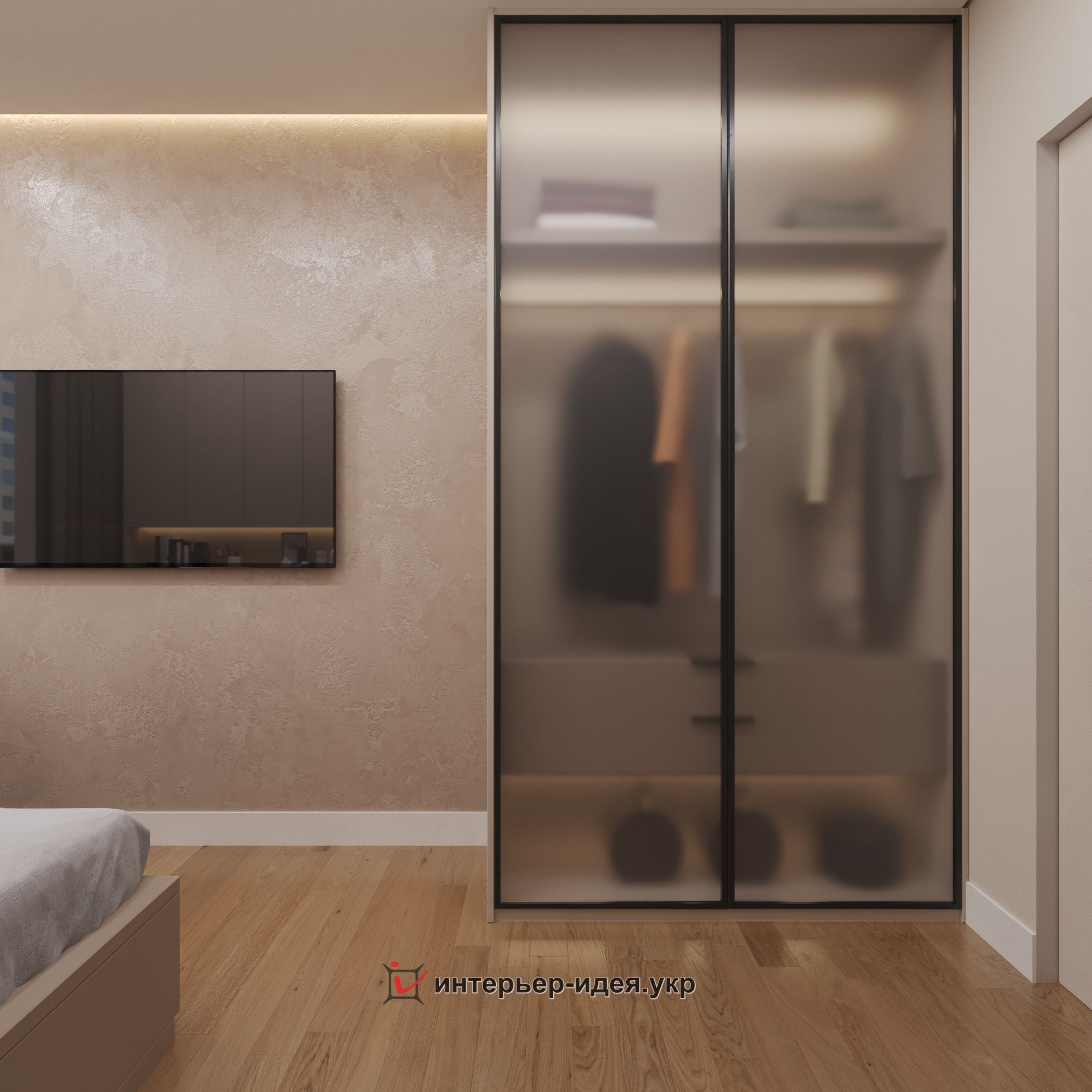 Акцентная стена выполнена декоративной штукатуркой с RGB подсветкой.