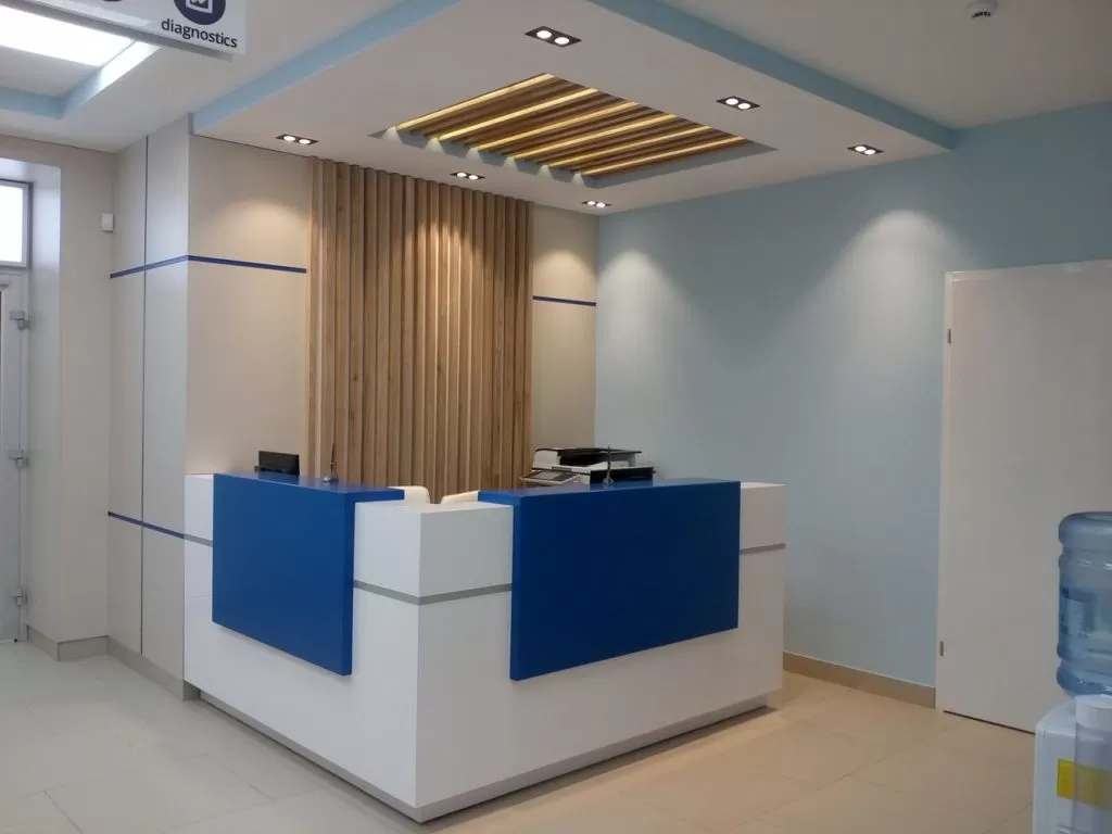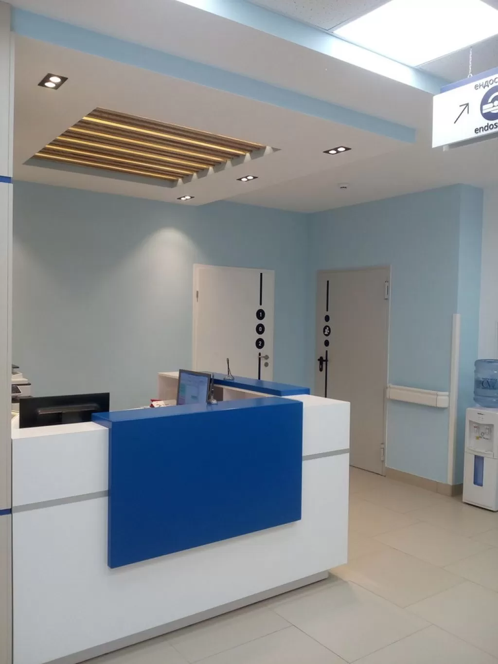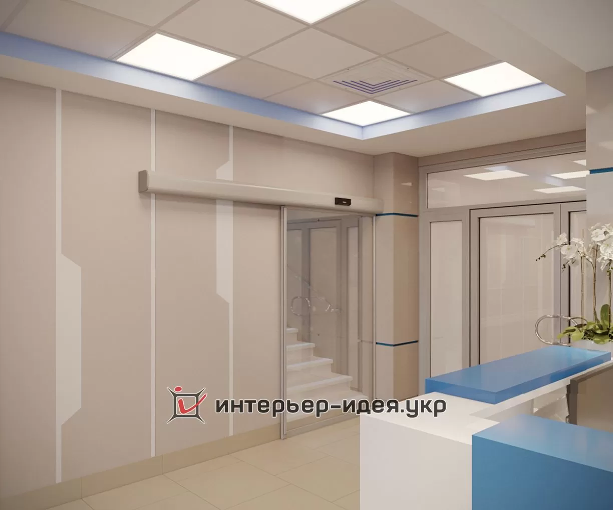Воплощение дизайн-концепции. Дизайн зоны ресепшн должен не только соответствовать требованиям санитарно-эпидемиологических норм, но быть удобным в процессе работы и нравиться сотрудникам. Постарались создать спокойную и комфортную атмосферу, потому что больше всего пациенты, страдающие от боли, нуждаются в расслабляющей обстановке, где можно отдохнуть морально и физически. Лестница, по которой спускаются пациенты, закрыта от сквозняка раздвижной дверью с матовым стеклом.