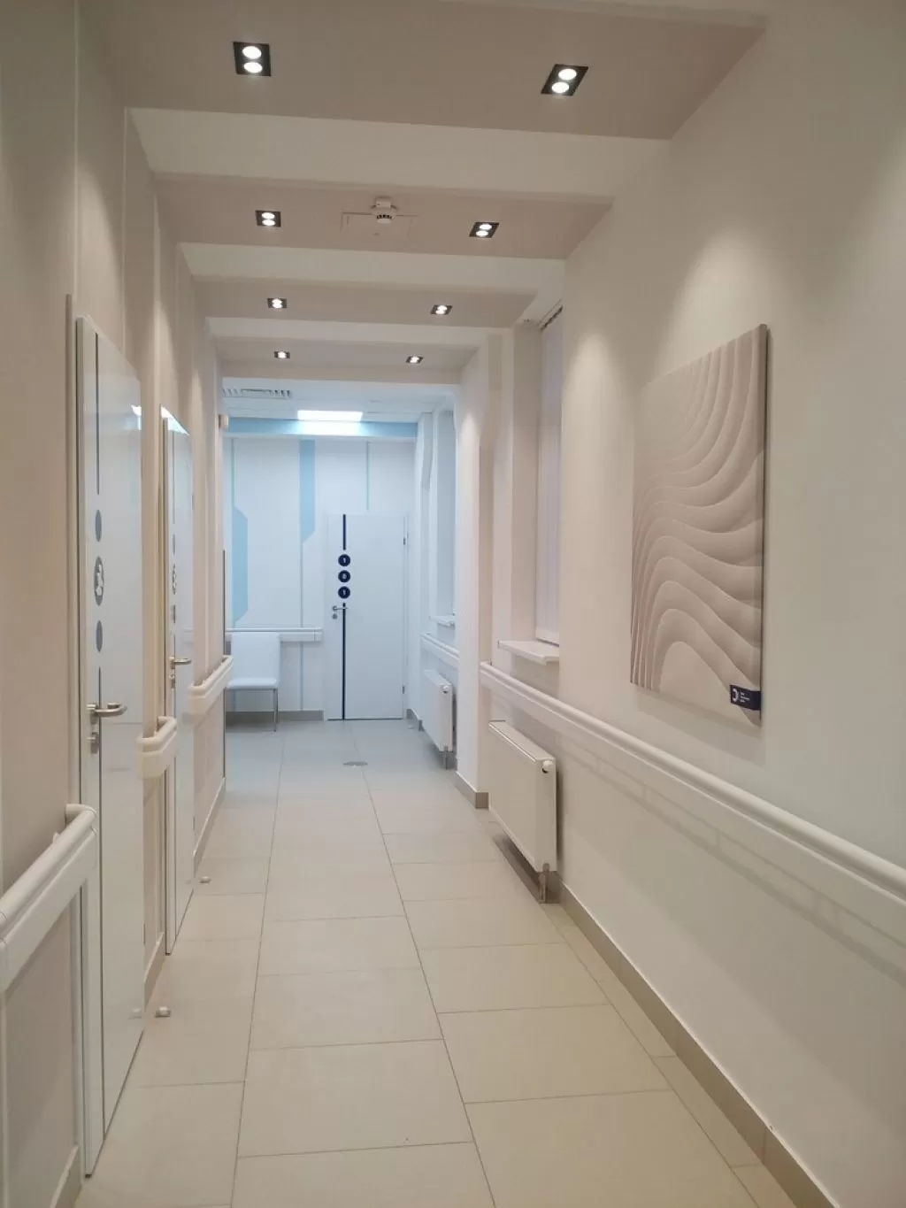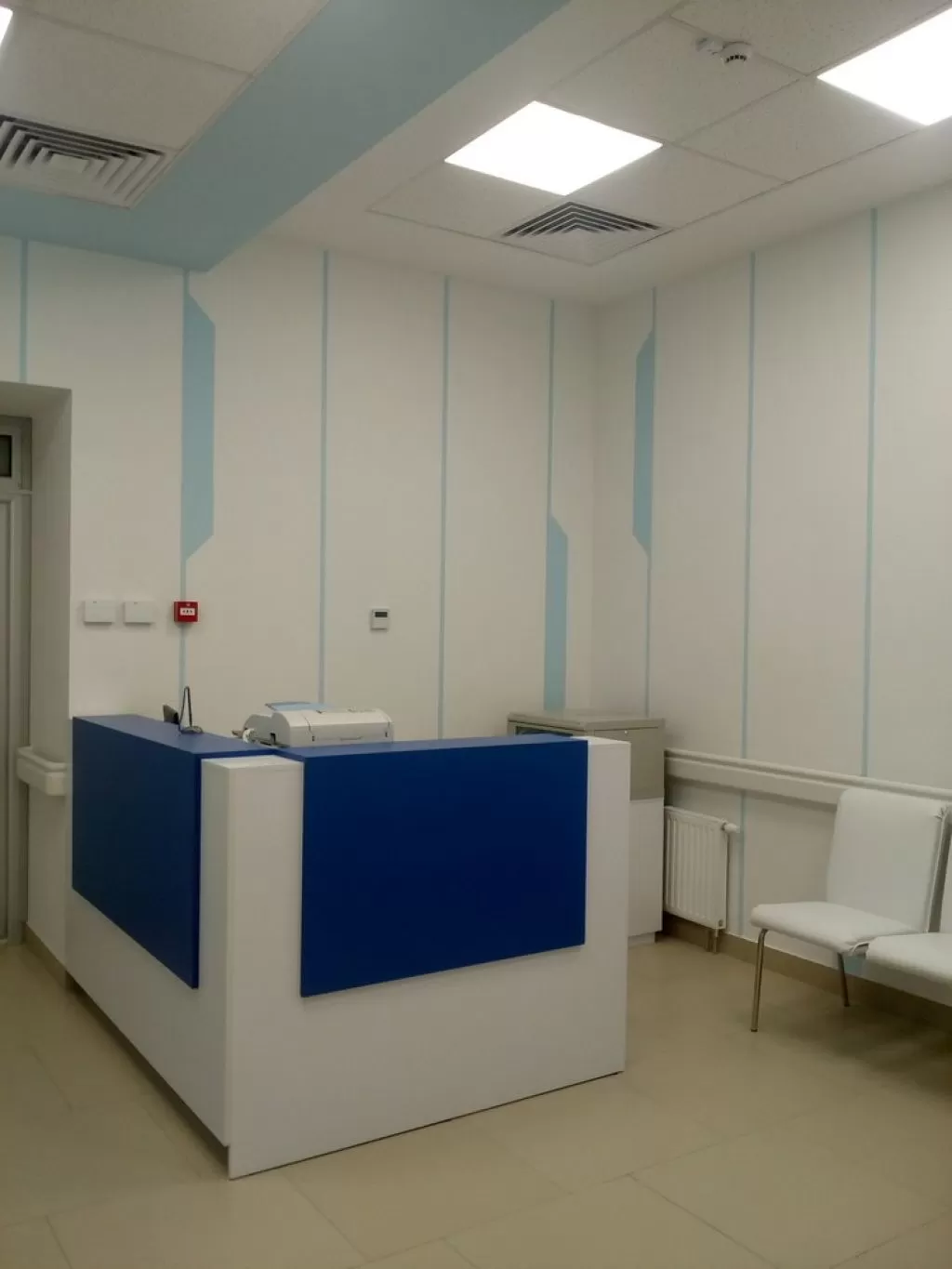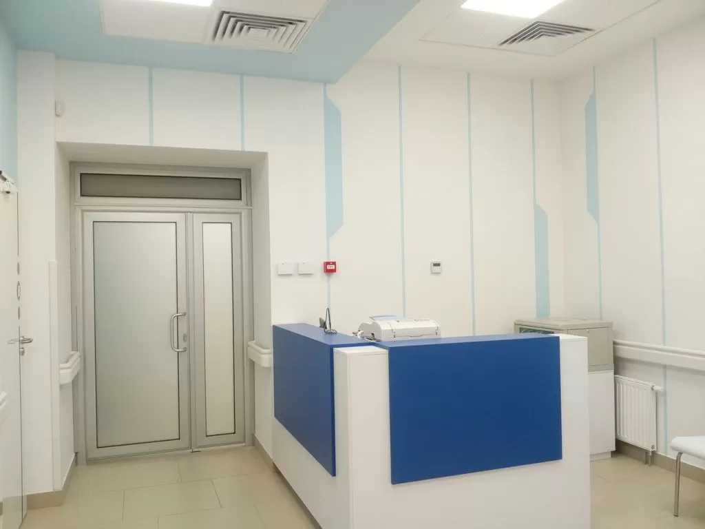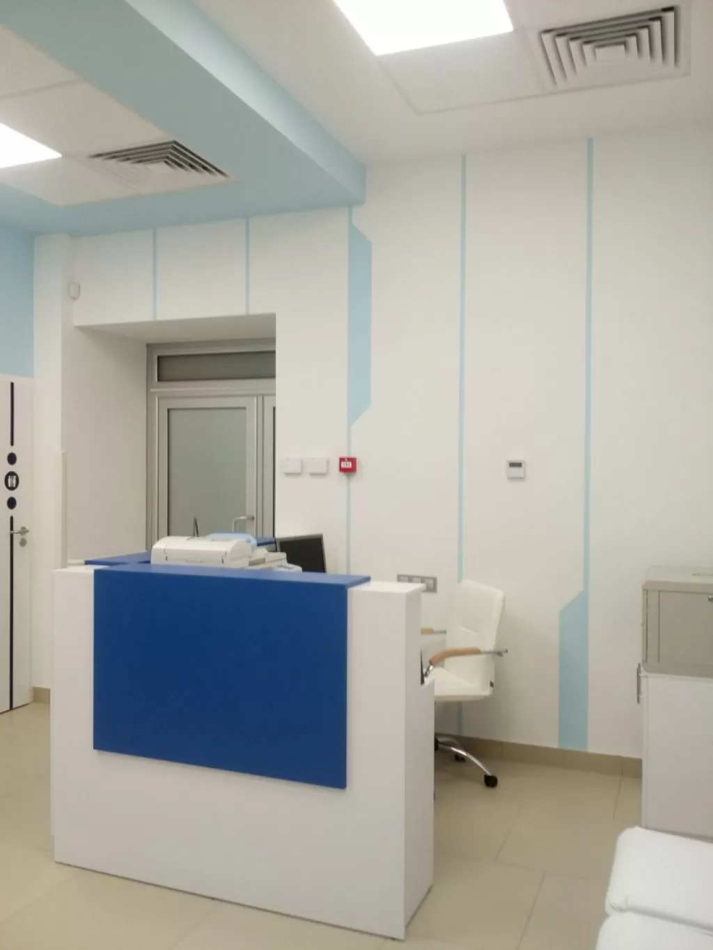 Стены оформлены гладкой покраской (цвета: белый и «Lazur 180» по палитре Caparol 3D Plus). Вдоль всего коридора в необходимых местах применены пластиковые настенные отбойники-поручни, которые защищают стены от механических повреждений и внешних загрязнений.Ресепшн (2500х2170 мм) выполнен из МДФ. Кресла «Dline Style» из серии "Соло" в двух цветах.На потолке использованы гипсокартонные конструкции с покраской в белый и голубой «Lazur 180» цвета по палитре «Caparol 3D Plus». Светильники потолочные светодиодные «EGLO 89489» (600х600 мм).На полу плитка «АТЕМ E0000» песочного цвета (600х600 мм).