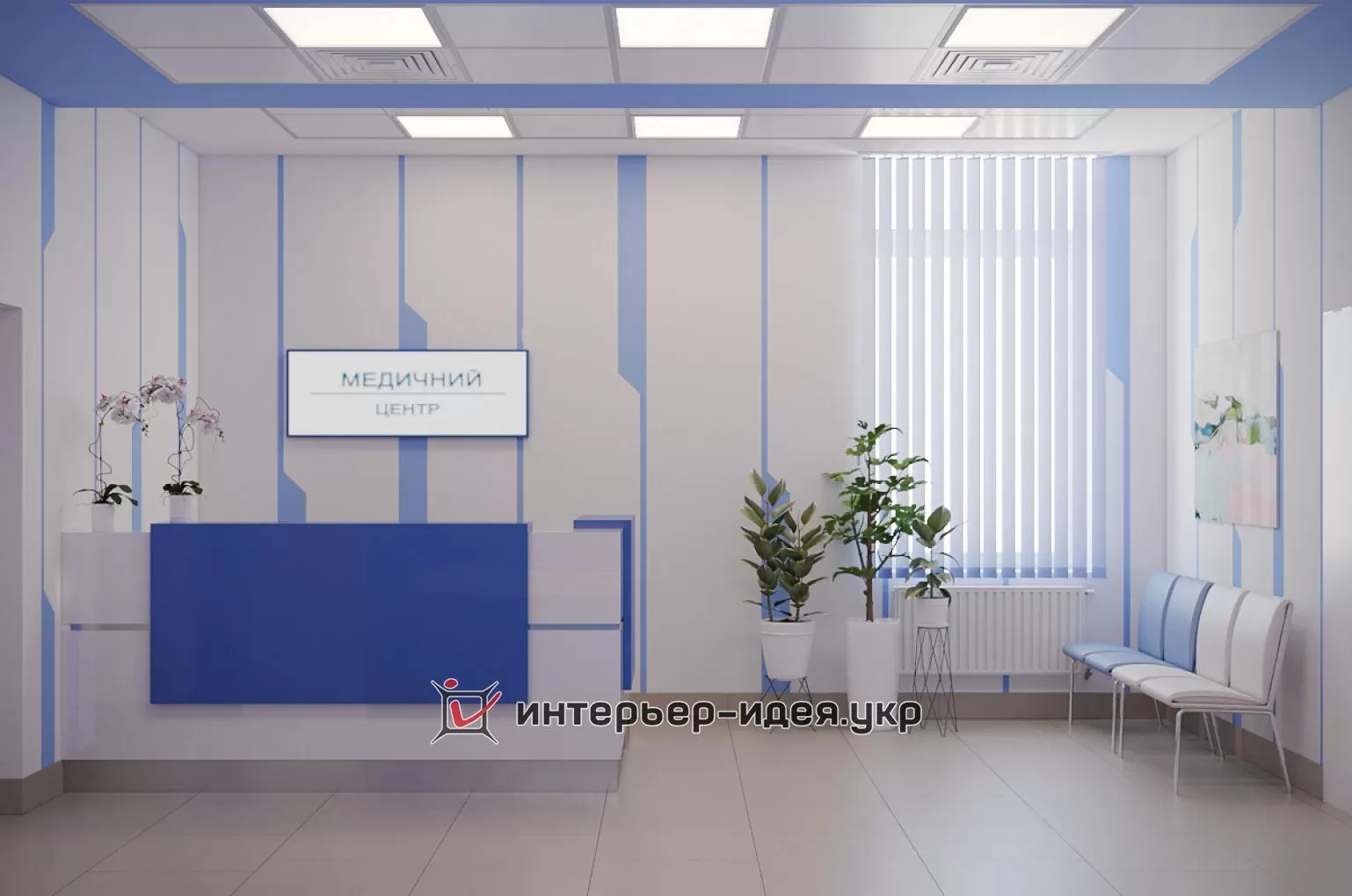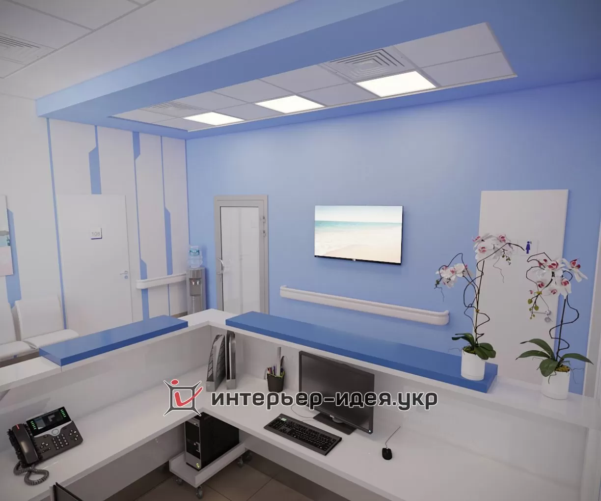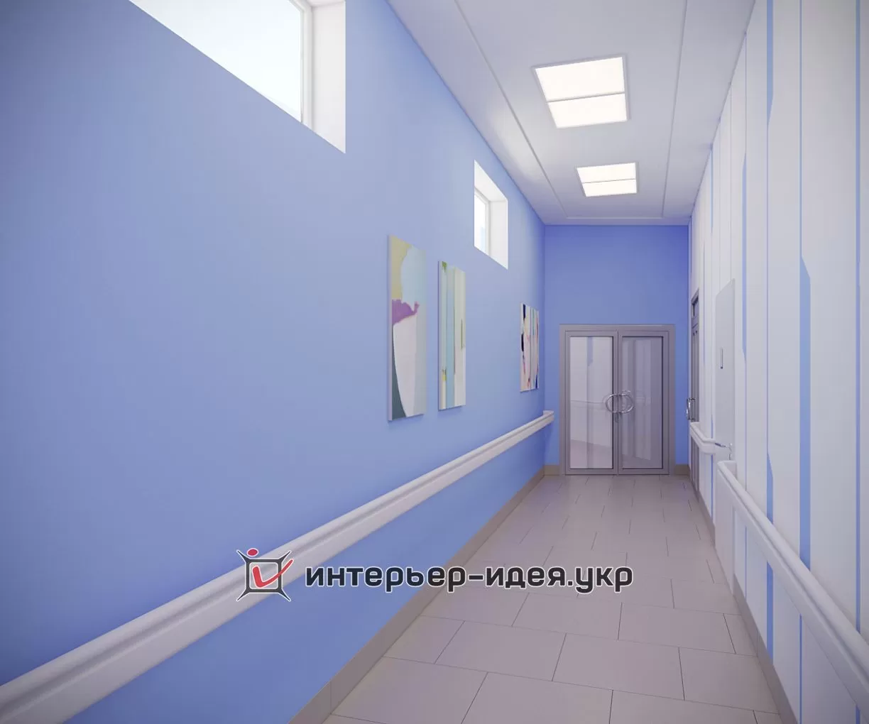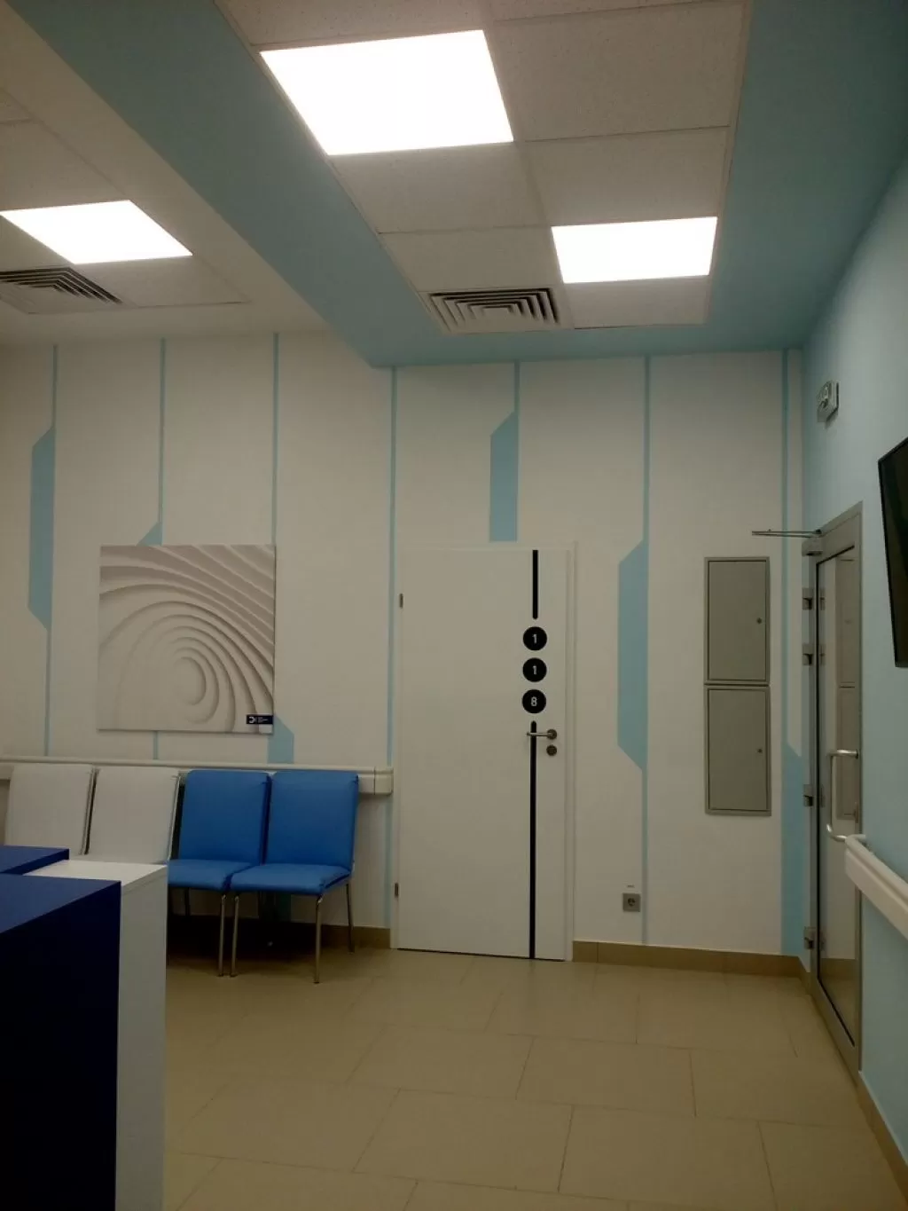 Стены оформлены гладкой покраской (цвета: белый и «Lazur 180» по палитре Caparol 3D Plus). Вдоль всего коридора в необходимых местах применены пластиковые настенные отбойники-поручни, которые защищают стены от механических повреждений и внешних загрязнений.Ресепшн (2500х2170 мм) выполнен из МДФ. Кресла «Dline Style» из серии "Соло" в двух цветах.На потолке использованы гипсокартонные конструкции с покраской в белый и голубой «Lazur 180» цвета по палитре «Caparol 3D Plus». Светильники потолочные светодиодные «EGLO 89489» (600х600 мм).На полу плитка «АТЕМ E0000» песочного цвета (600х600 мм).